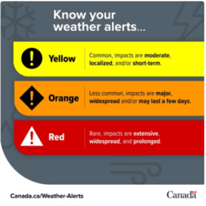 Canadians know how quickly the weather can change—and how important it is to be prepared for when it does. That’s why Environment and Climate Change Canada (ECCC) has introduced new colour-coded weather alerts. Under this new system all weather alerts—Warnings, Advisories, and Watches—are now colour-coded, moving from yellow, to orange, to red as the potential risk increases. ECCC’s forecasters choose the colours based on how confident they are that the weather will happen, and the possible impacts that weather may have. By giving alert colours meaning, Canadians are now able to get at-a-glance information about the potential risk a weather hazard poses to them. For more information on what the colours mean click here.